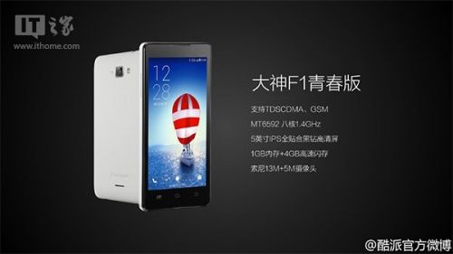 大神F1青春版采用5英寸全贴合黑钻屏,搭载MTK6592八核处理器,1300万像素主摄像头加500万像素前置摄像头,售价799元,9月2日与酷派大神F2同步发售。