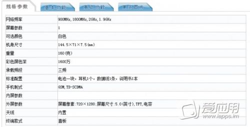 根据工信部提供的数据显示该机尺寸为144.5×71×7.5(mm),重160g,装备了分辨率为1280*720的5.0英寸TFT电容屏幕,1GB的内存,8GB的内置储存,最高支持32GB的MicroSD卡扩展,1.3GHz的四核处理器,500万后置摄像头和300万前置摄像头,运行Android 4.4.2系统。