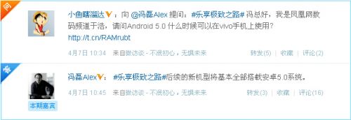 当然,由于vivo机型众多,基于Android 5.0的Funtouch OS到底会搭载哪些机型,也是用户非常关心的问题。除了目前已知的在5月新机上,会搭载全新的Funtouch OS之外,@冯磊Alex 也表示vivo后续的新机型将基本全部搭载基于Android 5.0定制的全新的Funtouch OS,这在国内厂商将是首次做到全机型适配。