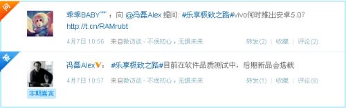 针对网友对于Android 5.0的咨询,@冯磊Alex 表示今年vivo不但有计划推出基于Android 5.0定制的Funtouch OS 3.0系统,并且表示目前已经在“软件品质测试中,后期新品将会搭载”!而从其他信息了解到,vivo的新品即将在5月上市,主打令人惊艳的外观,以金属和玻璃为主要材质!