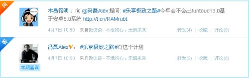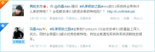 在7日上午的新浪微博“不泯初心、无惧未来”微访谈中,vivo全球副总裁兼首席市场官冯磊先生,首次表示vivo基于Android定制的Funtouch OS即将升级Android 5.0系统!