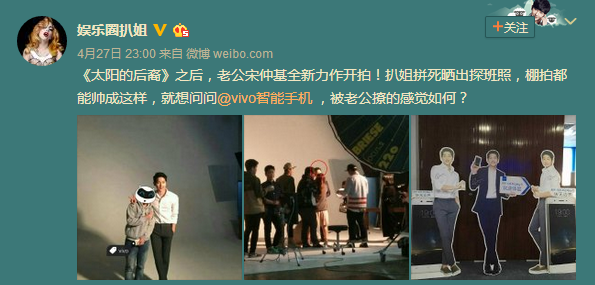 知名娱乐圈爆料评论人@娱乐圈扒姐就曾在其平台曝光了宋仲基拍摄vivo广告片的独家路透照,这也将成为宋仲基继《太阳的后裔》之后,在国内的又一"全新力作"。而据了解,目前vivo已经在其强大的线下销售网络布局宋仲基相关物料,凭借着宋仲基超高的人气,据传已经有网友准备组团到vivo智能手机相关门店"搬"人形立牌了。可见,此次vivo选择宋仲基作为全新代言人,必将非常成功。