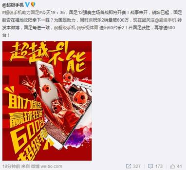 今日(9月6日)恰逢国足十二强首个主场比赛,乐视手机为国足助力,同时庆祝乐2销量破600万。微博乐迷关注@超级手机并 转发该条微博,国足每进一球,就送出60台乐2!若国足获胜,再壕送600台!