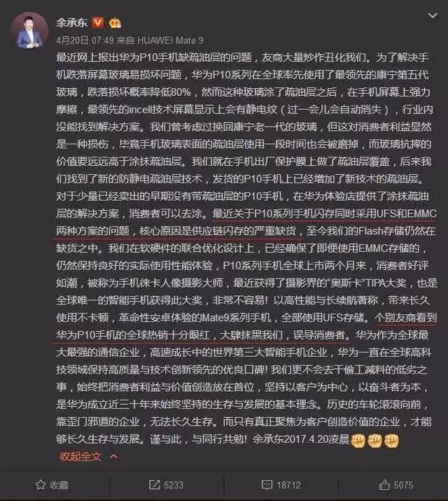 随后,余承东发布了第二篇公关稿,照旧没有正面答复问题,而是表示跑分、配置、规格什么的并不重要,存储问题并不是问题。