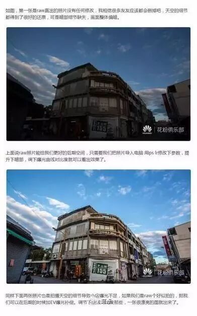 当时华为官微转载发布了一篇名为《P9媲美单反,专属单反RAW,98%的人不知道怎么用~!》的文章,这篇文章介绍了支持RAW格式,对于照片后期修正的强大效果。