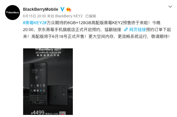 作为史上最好的黑莓手机,KEY2标准版已经于6月12日结束了第一轮的开售。此前一直有小伙伴们询问KEY2高配版机型,也就是升级为6GB+128GB高配版的发售时间,据黑莓官方微博透露,这款最适合商务精英人士使用的KEY2高配版将会于6月18日正式开售,现已正式在京东黑莓手机旗舰店开启预约了。
