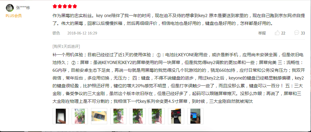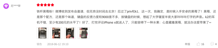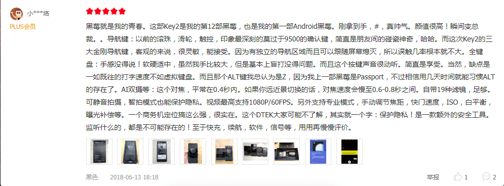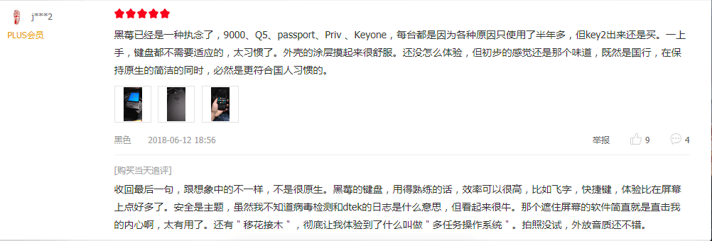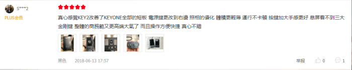 此外,相信很多小伙伴们肯定想了解黑莓KEY2首销后的口碑究竟如何吧?这次我们专门从京东商城上随便摘出了几条评价供大家参考!
