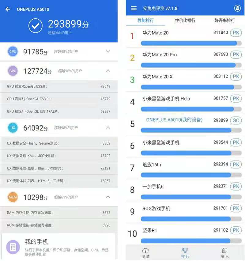 对于硬件方面,一加不用多提,毕竟以往都是采用旗舰芯片,本次也不例外。采用骁龙845处理器,ufs2.1芯片,安兔兔跑分293899分。