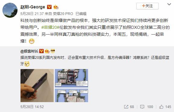 在强大的研发技术保证下,华为具备了持续创新的能力。今晚,荣耀将在上海发布荣耀20系列。荣耀20 PRO获得DXOMARK全球第二高分111分已经在伦敦发布会上曝光。但根据荣耀总裁赵明等高管的爆料,荣耀20系列国内发布还有其它技术上的巨大惊喜。