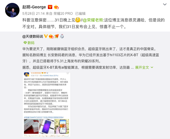 根据网友的爆料,荣耀20系列还将应用超级蓝牙技术。这得到了荣耀产品副总裁熊军民的转发,相当于承认了该技术的存在。爆料称,超级蓝牙基于华为自研Hi1103芯片,能够根据需要调度发射功率,达到最远130m的链接距离。熊军民称“说的不全对”,说明超级蓝牙技术远非目前曝光的那么简单。更多具体的信息,要等今晚的发布会才知道了。