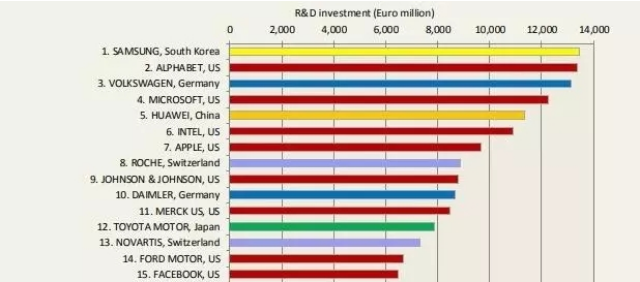 根据欧盟公布的报告,三星是全球投入研发最高的公司,其2017年到2018年的研发经费为134.37亿欧元,排在全球所有企业榜首,甚至超过了谷歌(133.88亿欧元)、德国大众(131.35亿欧元)等全球互联网巨头和汽车巨头。微软、英特尔和苹果等知名美国科技企业也只能位居四、六、七位。