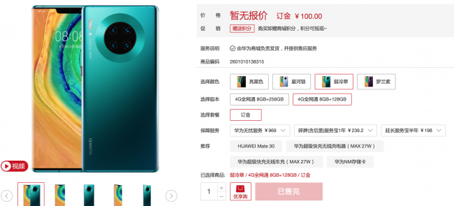 华为Mate30系列已于9月26日18:08正式开售,其中华为Mate30 6GB+128GB版、8GB+128GB版售价分别为3999元、4299元;华为Mate30 Pro 8GB+128GB版、8GB+256GB版售价分别为5799元、6299元。华为商城及线上授权电商平台,华为智能生活馆、体验店等线下门店均有销售。