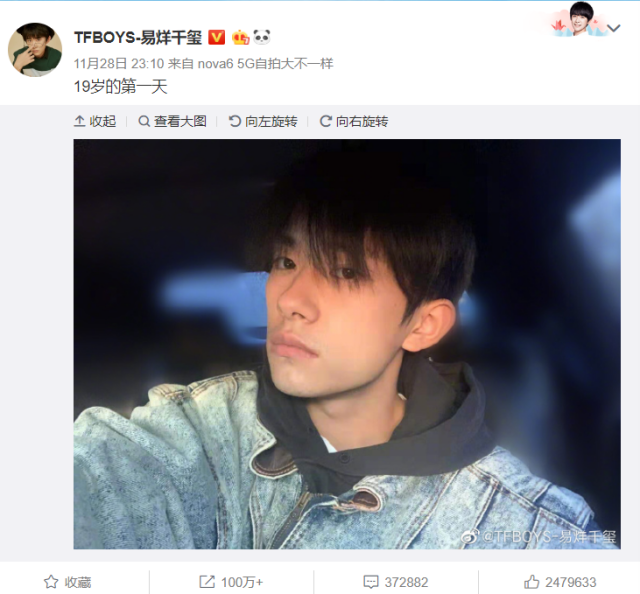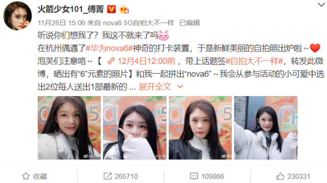 在年轻用户中人气火爆的易烊千玺、火箭少女101成员傅菁近期晒出的个人微博自拍中,微博小尾巴都显示为“来自nova6 5G自拍大不一样”。身为nova系列全球代言人的易烊千玺还在预热视频中展示了,华为nova6系列的105°超广角自拍能力,瞬间吸睛年轻消费者。