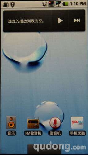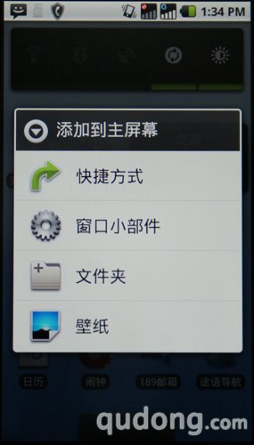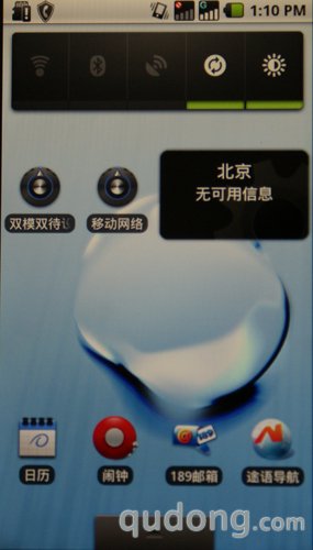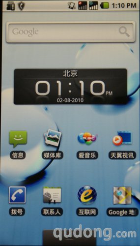 由于采用了1600万色480 x 854的FWVGA分辨率的屏幕,所以显示效果极好,图标清晰,过渡自然,再配上天蓝色的桌面给人一种很悠闲宁静的感觉。待机界面是由三张平行的界面构成,靠手指的左右滑动来相互切换,如果手指在屏幕上长时间按住,就可以将自己常用的项目添加到桌面上,非常的方便。