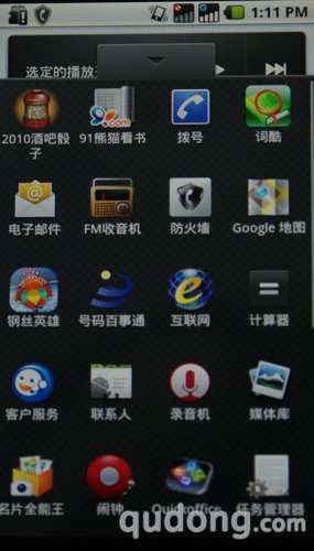 在屏幕的下方可以向上拉出主菜单,手机所有的应用程序都在这里显示,当然了,如果在屏幕上方的状态栏向下拉也可以,这里显示的是手机的防火墙、SD卡以及未接来电等一些通知。