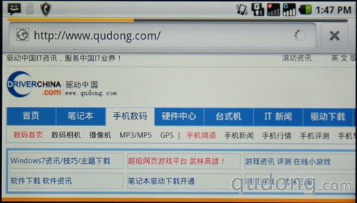 手机配备了3.7寸的大屏,由于采用了FWVGA的分辨率,所以在网页浏览时基本上不会出现空白,不过字体会稍微小一些。但是,XT800支持多点触控的功能,可以让我们轻松对网页进行放大缩小。