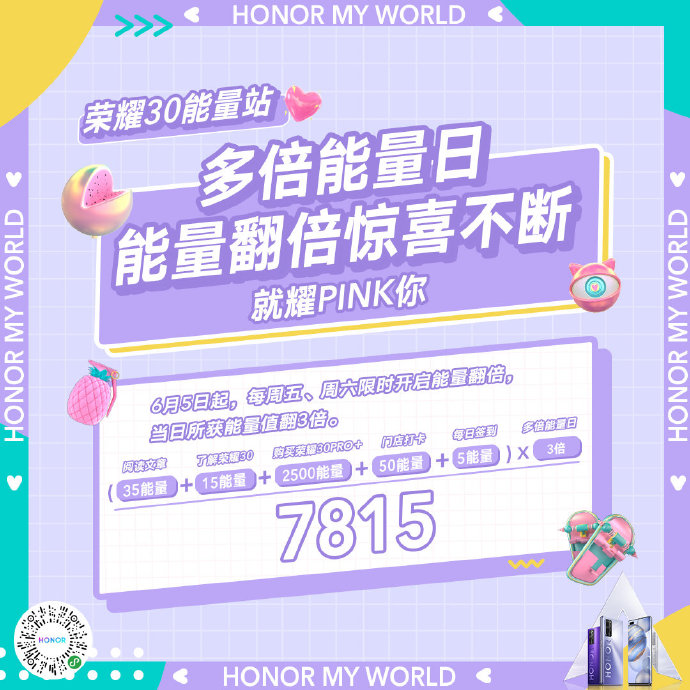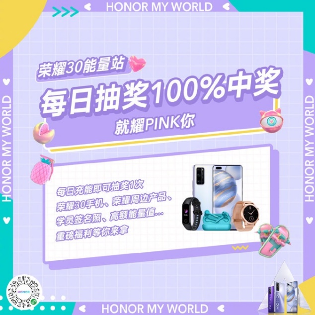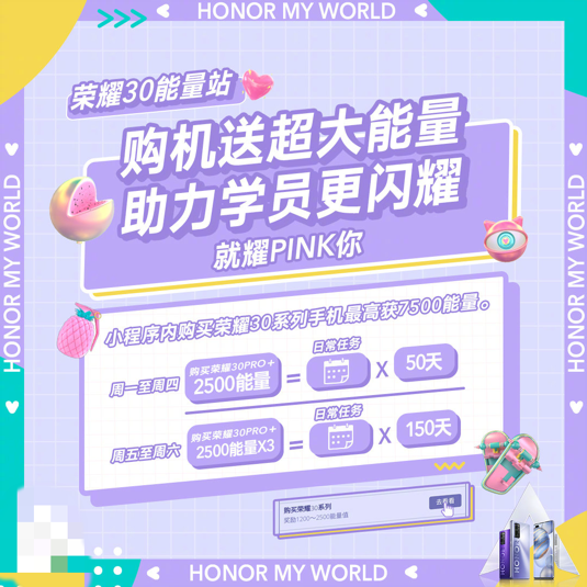 不仅如此,荣耀30能量站还为急需加速充能争取排名的粉丝准备了,每周五周六特别开放的多倍能量日和线下门店打卡以及一次性购机送超大额能量值的福利,亟待帮助学员上榜的粉丝可千万不要错过这些活动。