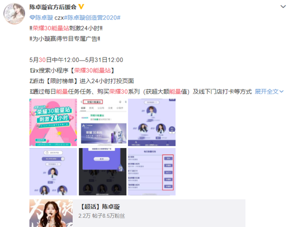 荣耀30系列不仅改变了我们日常生活的记录方式,更拓宽了我们对于节目赞助和品牌营销的认知。创造营2020比赛已走过半数,未来的竞争将会更加激烈,想要为自家学员拿到更多曝光权益,一起见证今夏的万丈光芒,就来荣耀30能量站,为她应援吧。