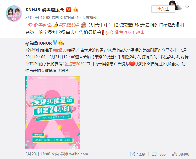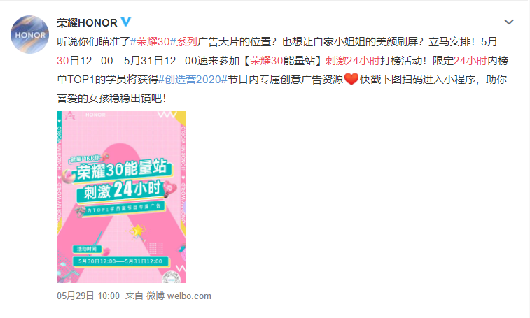 5月30日中午12点,荣耀30系列用“第三支亲密视角商务广告”拍摄权益做奖品,正式开启“刺激24小时”应援活动。截止31日中午12点,哪一位学员的能量值最高,她就是亲密视角创意大片的主演。
