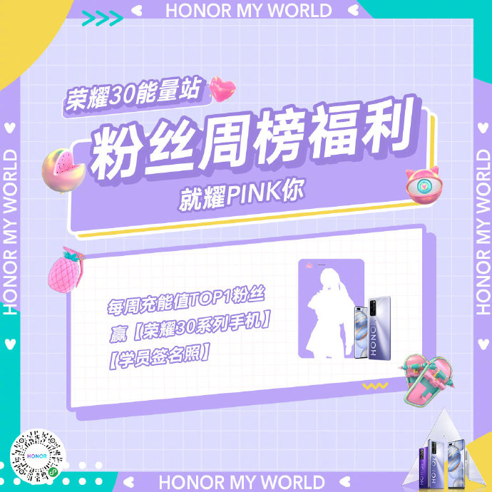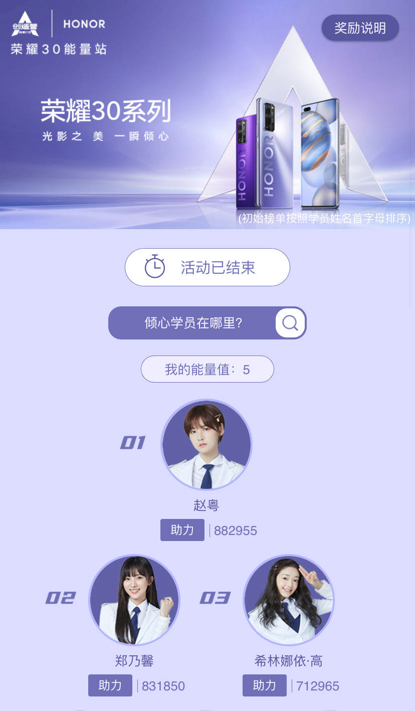随着荣耀30能量站的建立和升级,开始跟随节目进程与创造营节目、学员粉丝、三者强绑定。人气学员通过拍摄荣耀30广告片获得更多曝光,粉丝们也被升级后的能量站活动持续吸引。因为荣耀30能量站最新上线的学员周榜及粉丝周榜、幸运抽奖等福利玩法将释放大量权益和奖励。