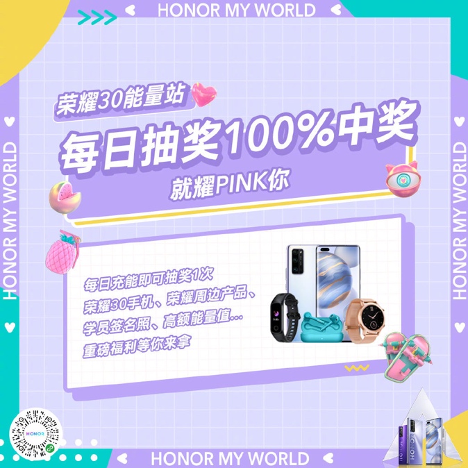 同样的,荣耀30能量站也在品牌实力加持,以及上线的学员周榜及粉丝周榜、幸运抽奖、多种能量值获取方式等福利玩法成功吸引到众多粉丝和官方后援会不断参与活动,阶梯释放出的大量权益和奖励满足了学员想要曝光,粉丝获取福利的双方基本诉求。