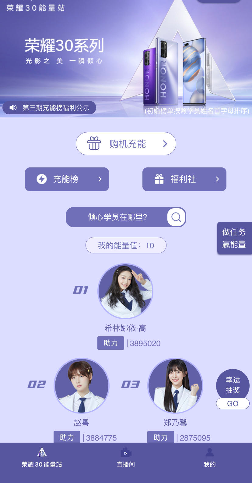 【荣耀30能量站】立足于荣耀30系列品牌影响力和不断释放出来的各种曝光资源,现在是粉丝后援会暗中比拼实力的必争之地,也是现阶段影响力最大的应援站点之一。二期学员周榜始于5月30日,最终由希林娜依·高拔得头筹,能量值实现反超,成功打败赵粤,拿到学员周榜top1专属曝光资源。