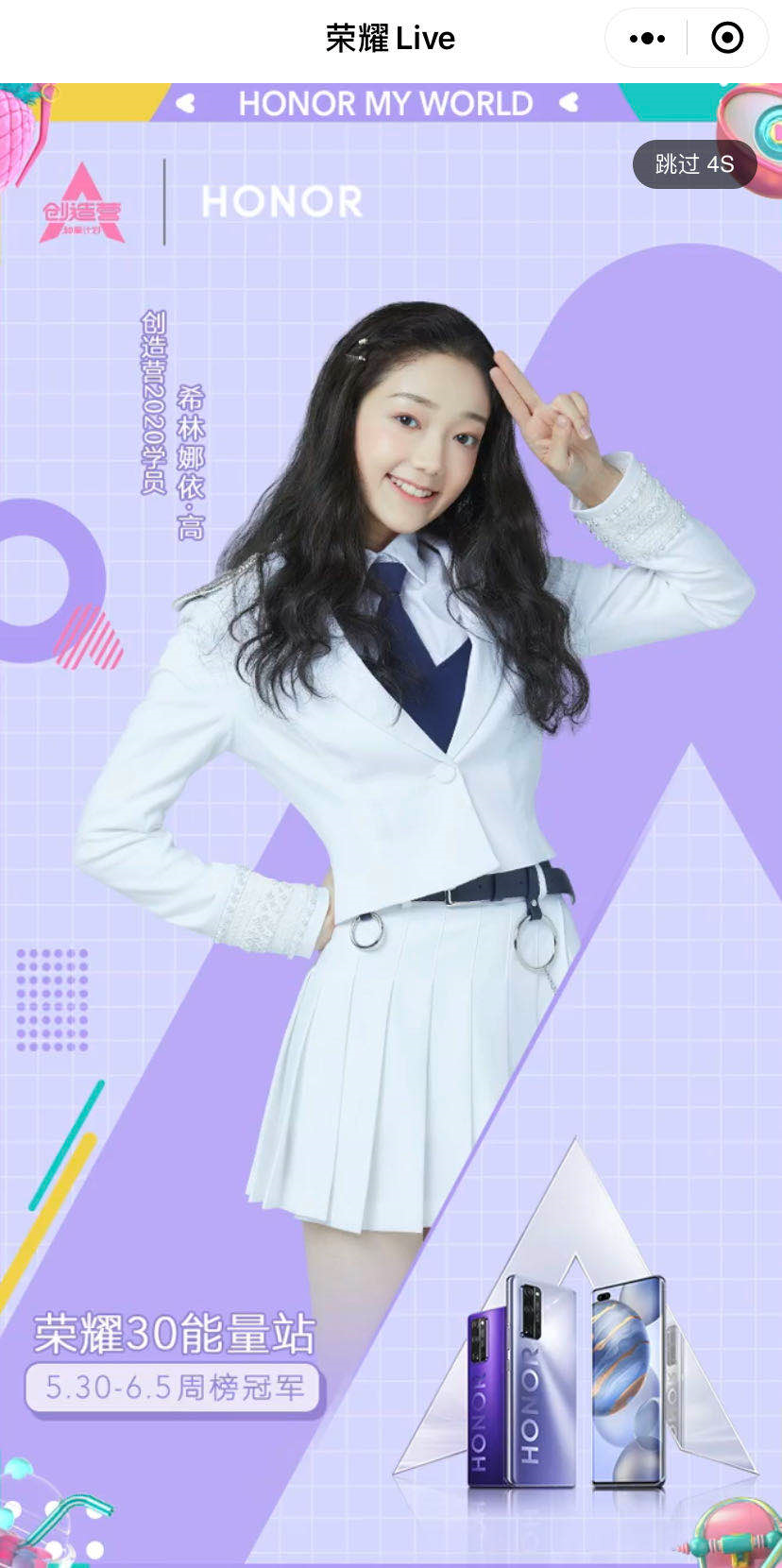 荣耀30系列从创造营2020节目开始到如今一直在用其独有的品牌理念改变我们对生活与偶像的记录和应援方式。想要为创造营2020学员获得更多曝光权益,跟她一起见证今夏的万丈光芒,现在微信搜索 [荣耀30能量站]小程序,为她应援充能吧。