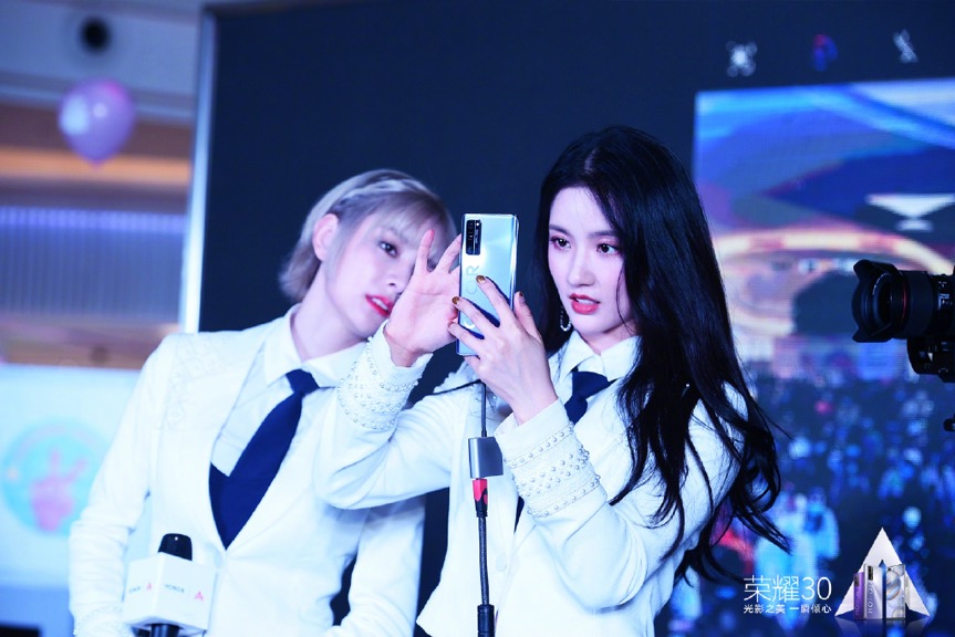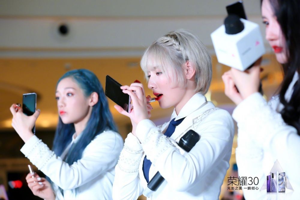 而在20日举办的见面会上,赵粤、希林娜依·高、刘些宁三位也首次在公开场合手持荣耀30系列流光幻镜画口红补妆。