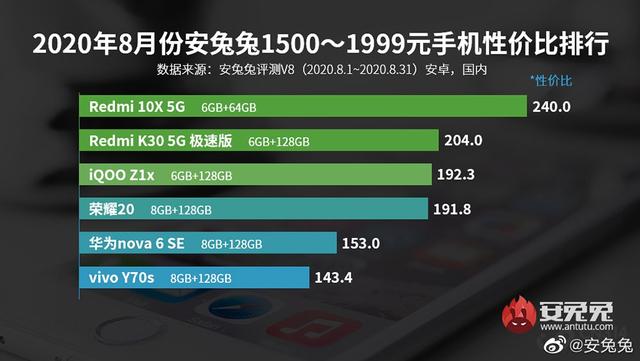 首先两千元左右以下这个价格段,性价比最高的5G手机依旧是Redmi 10X,并且是断层第一,优势非常大。
