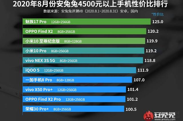 4500元以上的手机,大家觉得性价比最高的手机是谁呢?小米10至尊纪念版?并不是,安兔兔给出的这个价位第一名是已经发布很长时间的魅族17 Pro,大家惊不惊喜?意不意外?上个月万众期待的小米10至尊纪念版只能排到第三的位置。