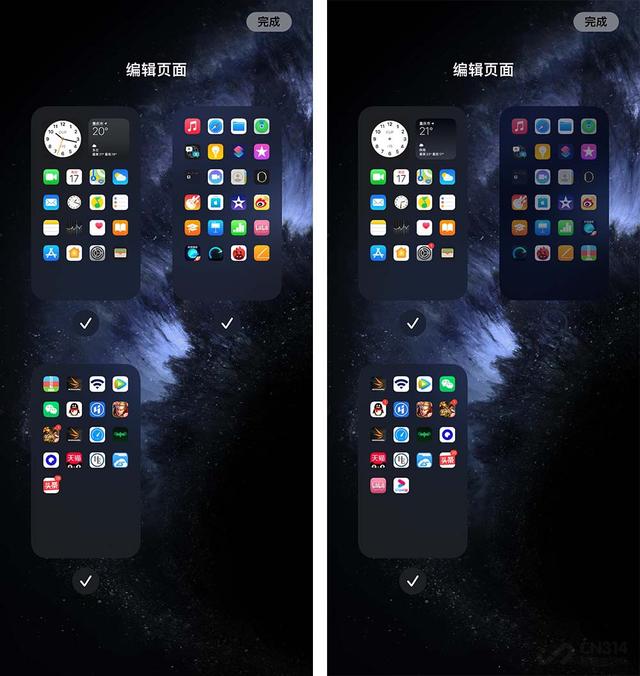 当你觉得桌面页数太多,还可以将部分页面隐藏起来,长按主屏幕,点击“...”进入编辑页面,取消勾选就能隐藏一个桌面页面,可保留一页,把常用的 APP 放在该页面。
