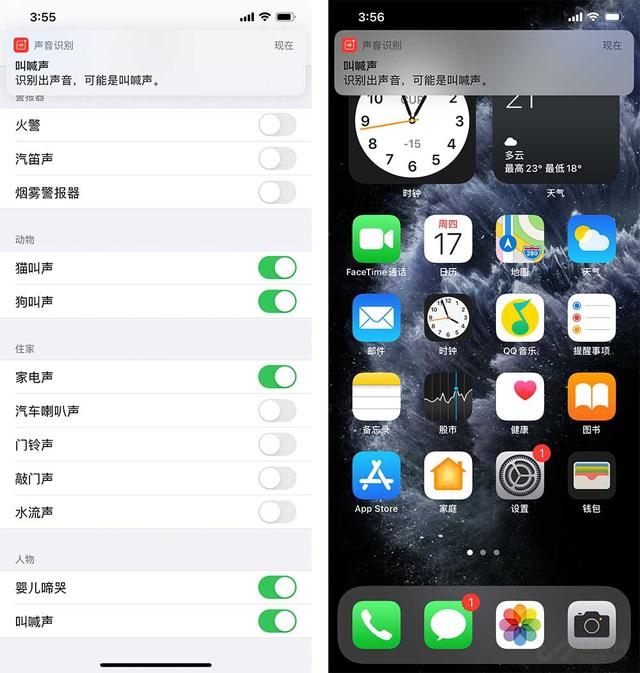 iOS 14辅助功能中新增了一个声音识别功能,就是能识别出猫叫声、家电声、水流声、婴儿的哭泣声等等,就一天的使用体验来看,声音识别并不是很准确,明明有猫叫声但并不显示,不过叫喊声倒是能准确识别出来(苹果在显示声音的时候也很机智的用了“可能”二字)。苹果加入这项功能应该是为那些耳朵患有疾病或耳聋人士考虑的。
