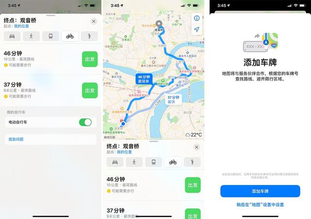 在iOS 14中,地图加入几个新的功能,提供了自行车骑行路线(包括电动自行车),可显示道路繁忙程度、楼梯的路线、带电动车充电站的路线等。另外针对国内用户限号出行也提供了“添加车牌”,根据车牌号查找路线,助你避开限行区域。