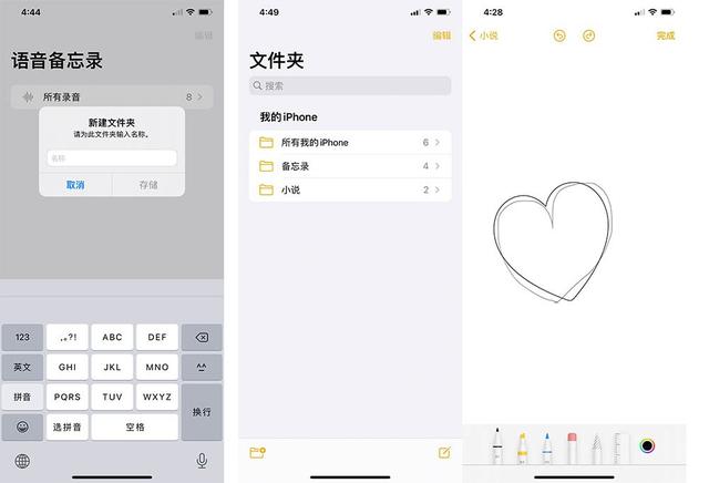 以前存放在备忘录里的信息太多了,查找起来很麻烦,而在iOS 14中的语音备忘录、手写备忘录中都可以添加自定义文件夹,可以将备忘录设立不同类别,生活、工作分开存放,查找起来更方便。