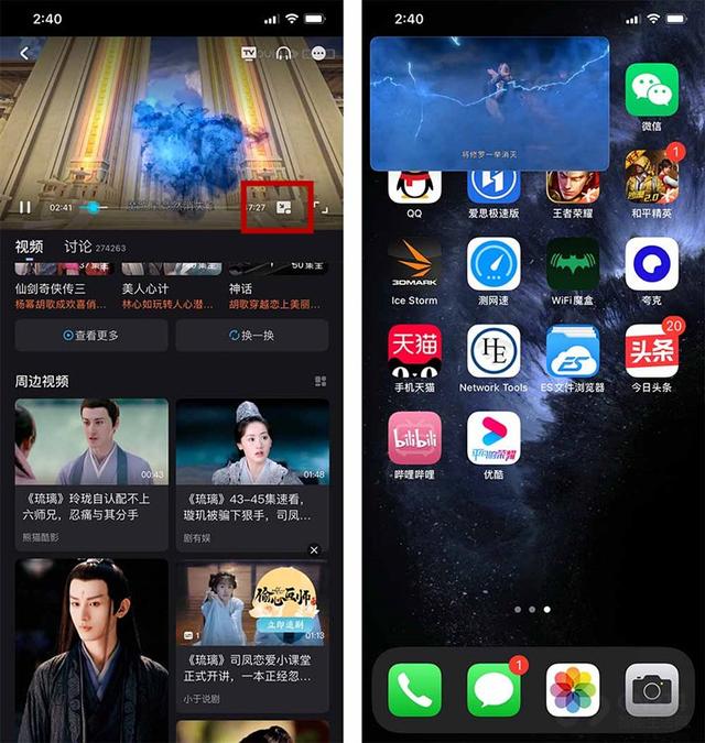 iOS 14还引入了国产安卓常见的画中画功能(之前只是 iPad 独有),点击视频上的画中画按钮后视频内容就变成一个小窗,能直接回到桌面或存在其他APP页面中,支持任意拖动位置,你也可以直接把它隐藏在侧边栏,且不会中断视频的音频。目前支持B站、优酷等视频APP,某一些视频APP还并未支持。