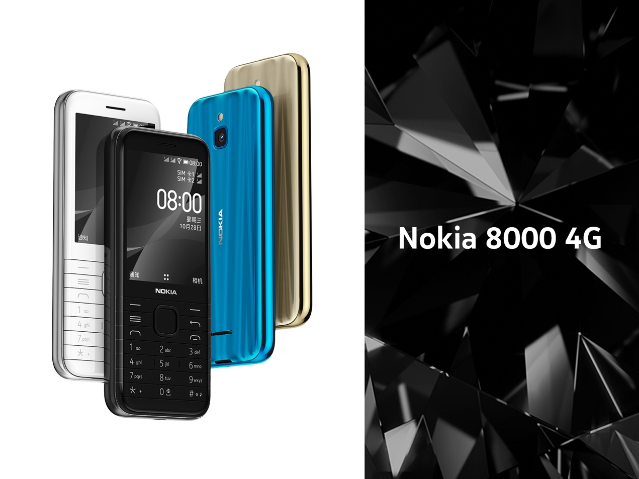 Nokia 8000 4G 提供黑色、白色、蓝色和金色四种配色,售价 699 元,12 月 30 日开启预售,2021 年 1 月 6 日正式开售。