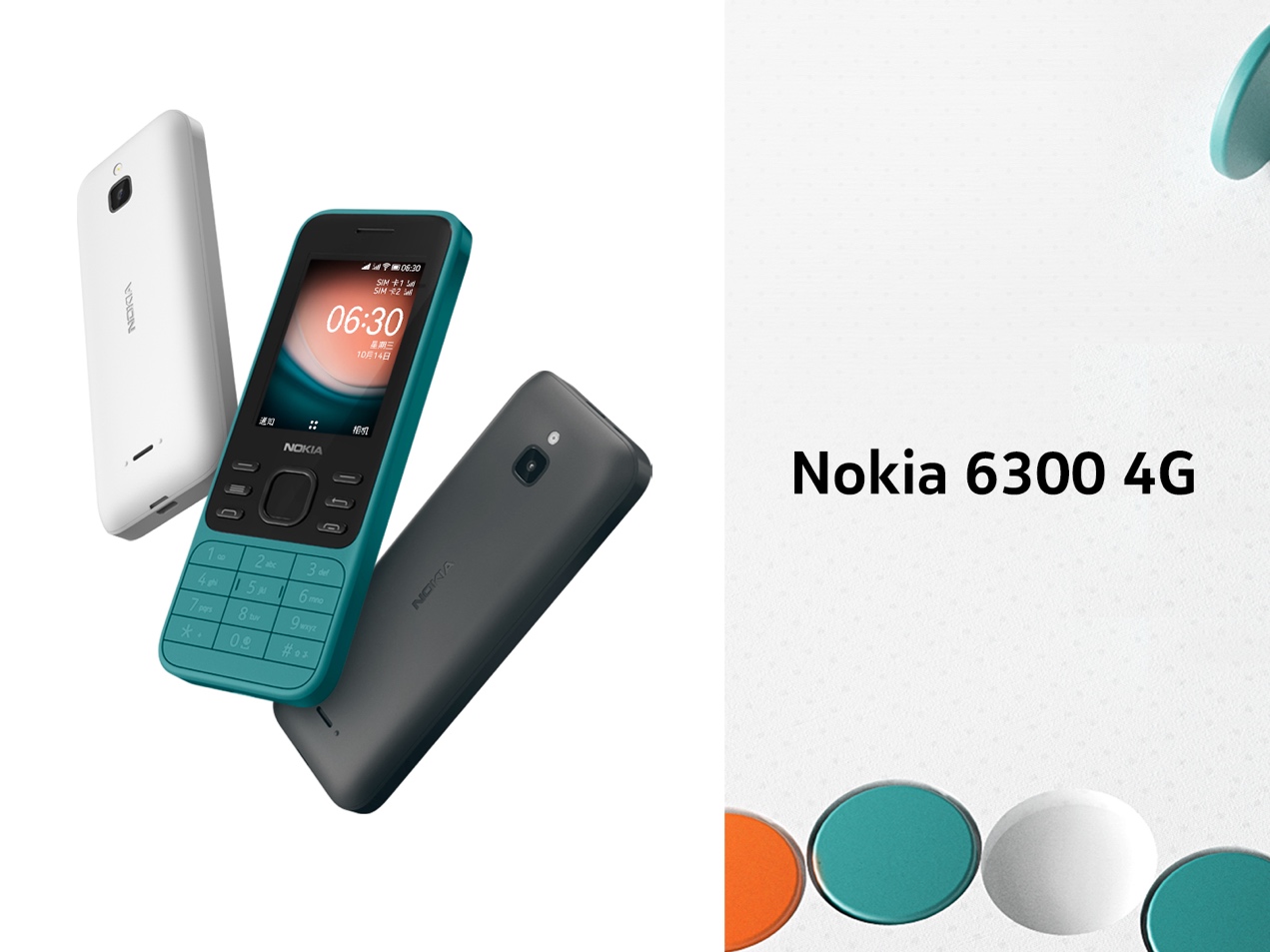 Nokia 6300 4G 提供黑色、白色和蓝绿色三种配色,首发价 399 元,12 月 21 日开启预售,12 月 28 日正式开售。