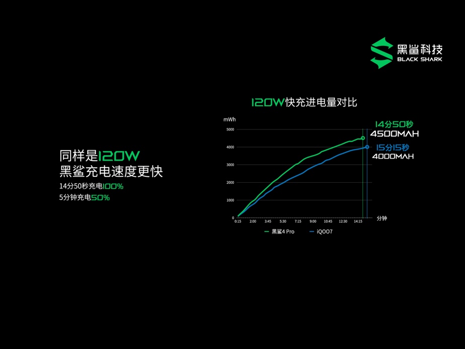 伴随高画质、高帧率、高性能的游戏体验,玩家对游戏手机的续航能力和充电速度提出了更高的要求,为了彻底解决用户的续航焦虑,此次黑鲨新品全系支持120W大功率极速闪充,同时内置4500mAh超大容量电池,全系标配120W充电器与6A充电线,在电池容量和充电速度上处于业界领先的最佳组合方案。