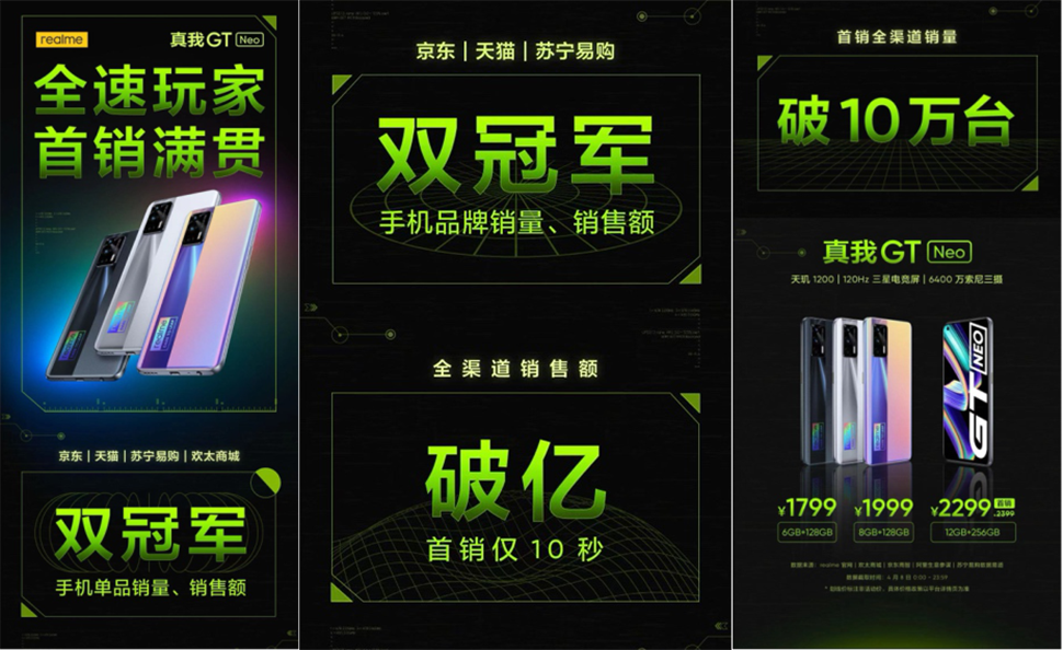 机圈潮牌realme首款天玑1200旗舰真我GT Neo于4月8日正式开售,发售当日全网销售额实现10秒破亿、首销全渠道销量超10万台,同时成为当天京东、天猫、苏宁以及欢太商城手机单品销量与销售额双料冠军,热度不断攀升。