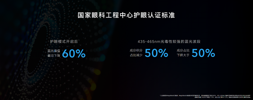 此外,荣耀MagicBook 14/15锐龙版的护眼模式还通过了国家眼科工程中心的护眼专业测试,在开启护眼后可有效减少有害蓝光辐射。以荣耀MagicBook 15锐龙版为例,经过国家眼科工程中心的测试,在电脑开启护眼模式后,蓝光峰值最高下降60%,435~465nm光毒性较强的蓝光波段成分积分占比减少50%。此外,荣耀MagicBook护眼模式还能通过调整屏幕亮度和显示色温,预防视疲劳,提高眼部舒适度,为年轻人带来更安心的护眼保障。