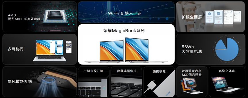 荣耀MagicBook 14/15锐龙版2021款集合护眼全面屏、多屏协同三窗口多开等创新技术,依托最新的锐龙5000系列处理器,以及出色品质与高颜值设计,释放轻薄生产力,为当代青年群体带来高效、健康与轻便的PC使用体验,再次树立行业轻薄本新标杆。