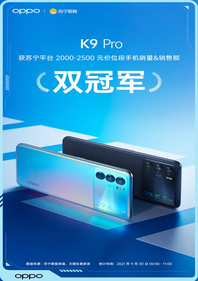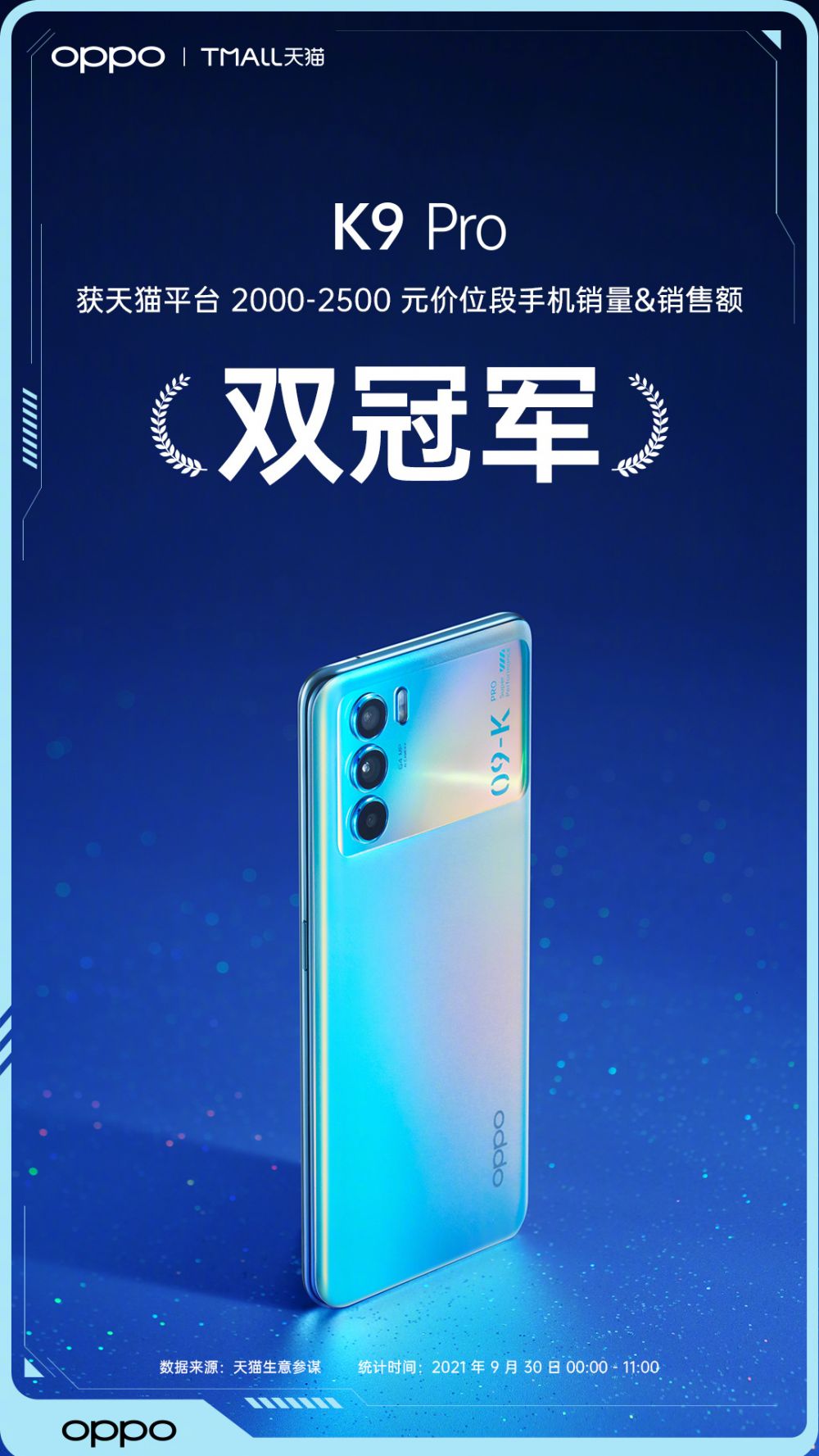 驱动中国2021年9月30日消息,OPPO K9 Pro于今早10点正式开售,仅过一小时不久,OPPO官方发布微博称,K9 Pro荣获京东、天猫、苏宁易购、欢太商城平台2000-2500价位段手机销量&销售额双冠军!