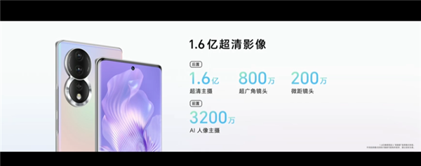 影像上,搭载了1.6亿像素超清主摄及多项影像技术,其中前置5000万AI人像主摄+200万景深镜头,后置配备5000万像素AI超广角微距镜头,并支持122°取景范围及AI自动切换微距模式。同时最小对焦距离可达2.5cm,以及200万景深镜头。