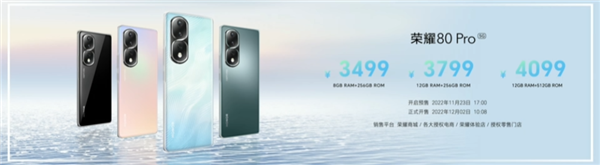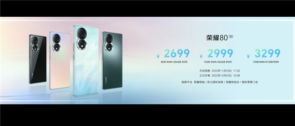 价格方面,荣耀80 8GB+256GB售价2699元、12GB+256GB售价2999元、12GB+512GB售价3299元,将于12月2日正式开售。