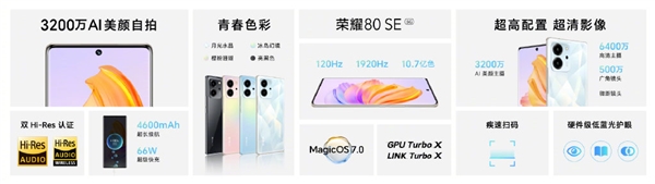 配置上,屏幕同样搭载10.7亿色光滑曲屏,拥有120Hz刷新率以及1920Hz高频PWM调光。该机背部搭载6400万高清主摄 、500万像素广角镜头以及一颗微距镜头,前置3200万像素的AI美颜主摄。续航上,配备了电池为4600mAh,支持66W有线超级快充。官方测试,荣耀80 SE仅需30分钟就能充至80%。