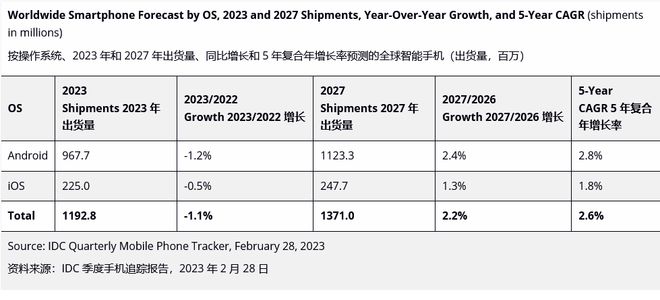 IDC表示:随着成本的增加和消费者需求的持续挑战,OEM 厂商对2023 年的出货量依然持谨慎态度。智能手机行业仍然存在很多不确定性和缺乏信任,这导致全球市场可能将在 2024 年才能恢复增长。此外,IDC还表示,对比 iOS 设备,Android设备今年的出货量百分比下降幅度预计更大。其设备出货量将下降 1.2%,而 iOS 设备出货量将下降0.5%。