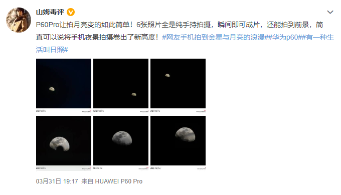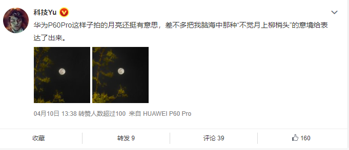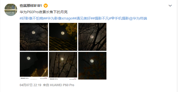 与此同时,对于大多数普通用户来说,也能够使用华为P60 Pro随手就拍出闪耀整个朋友圈的“超级月色”。比如在更大社交平台上,大家纷纷晒出华为P60 Pro拍摄的“月色照”,充分展现出华为P60 Pro即使在夜晚光线不足的情况下,依旧能够拍出“专业级”大片。正如这位网友所言:“P60Pro真的绝绝子一拍就是大片”
