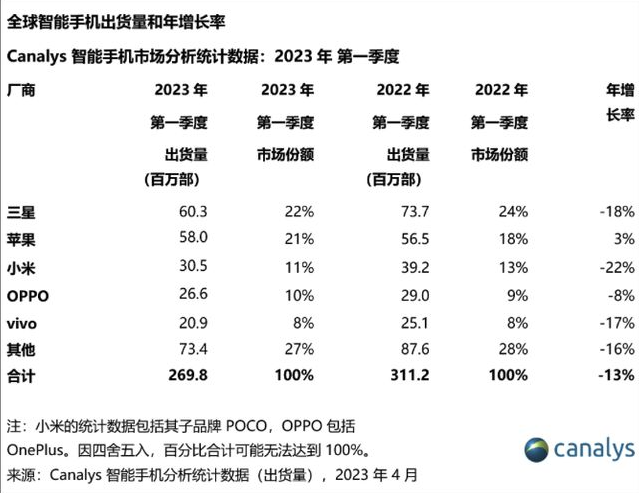 驱动中国2023年4月28日消息,近日,据市场调研机构Canalys最新报告指出,2023年第一季度全球智能手机出货量下降13%,跌至2.70亿部。报告指出,虽然2022年第一季度和2023年第一季度的出货量差异仍然较为明显,但需求的下滑已开始趋于平稳。