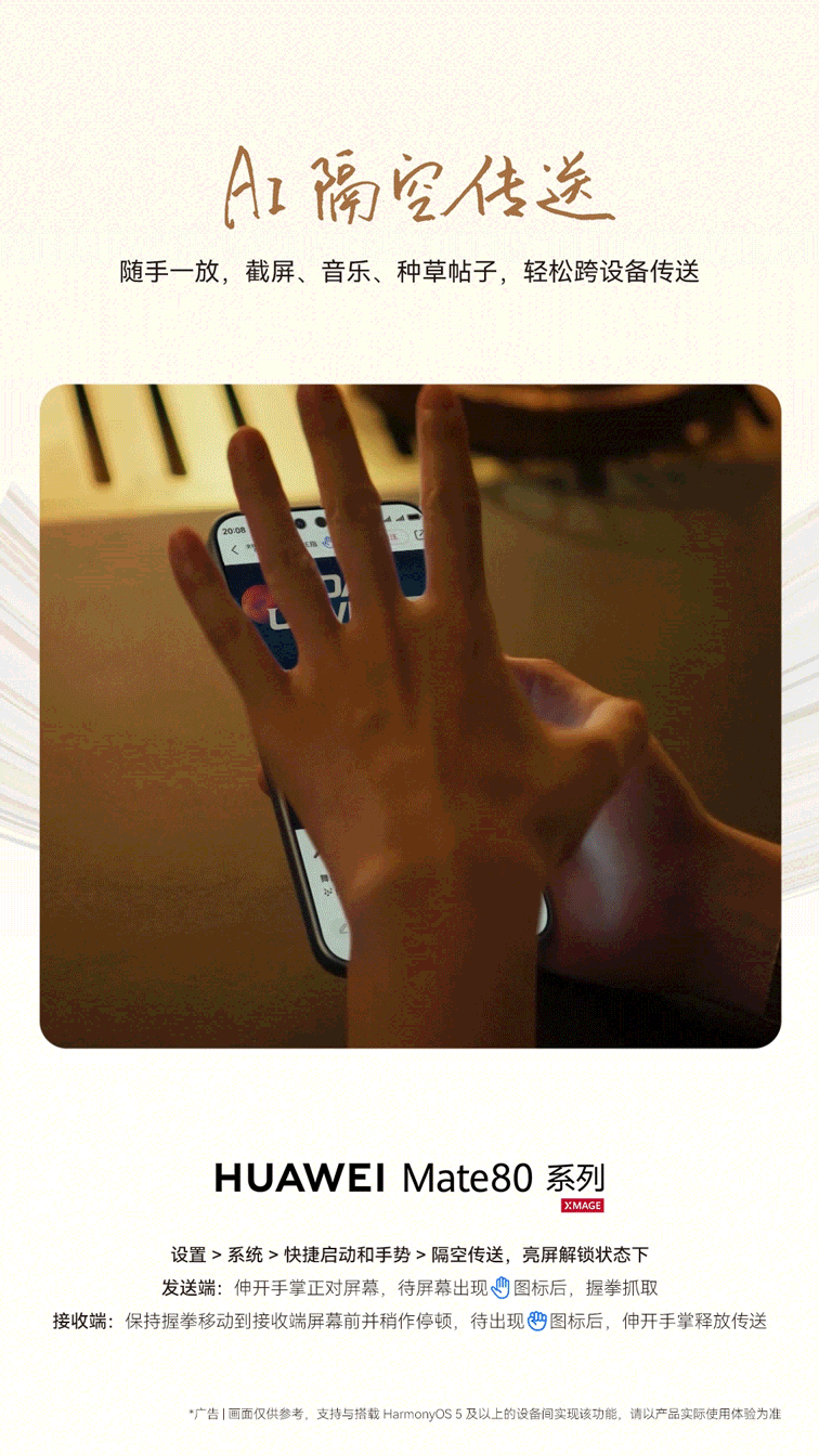 这种无感却高效的体验,在生活细节中尤为突出。例如在会议室,我需要把一份PPT快速分享给隔壁桌的同事。以往的操作是:解锁手机、打开企业微信—找文件—发送—等待上传—对方接收—等待下载,文件稍微大一点就要等很久,打断会议节奏。但华为Mate 80系列支持AI隔空传送,能实现点对点的屏幕内容传送,十分便利。比如,我只需要对着自己手机屏幕做一个“抓”的动作,再对着同事手机屏幕“放”,PPT会马上出现在他手机里,全程都不需要碰手机,也无需繁琐的操作。