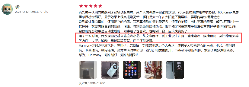 翻看华为商城、京东、天猫的用户评价,除了“外观好看”“高级感十足”“系统流畅”“电池耐用”“充电速度快”这些常规优点,很多用户在评价中还提到“AI功能很聪明”“隔空传送太方便”“碰一碰传文件超快”。这说明,华为Mate 80系列在功能的设计上,已经跳出传统的“人找功能”逻辑,而是按照“服务找人”的智能体验设计——系统主动感知场景,在你需要时自动提供最适配功能。这不仅是技术升级,更是AI体验理念的行业范式转变,让智能真正融入生活节奏,而非制造额外操作负担。